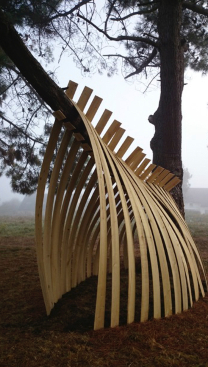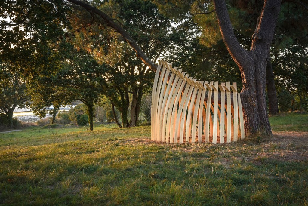 En guise de côtes, de simples voliges cambrées comme des bordées de navire forment l’habitacle.
