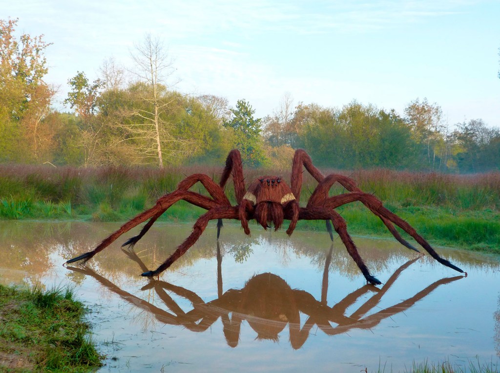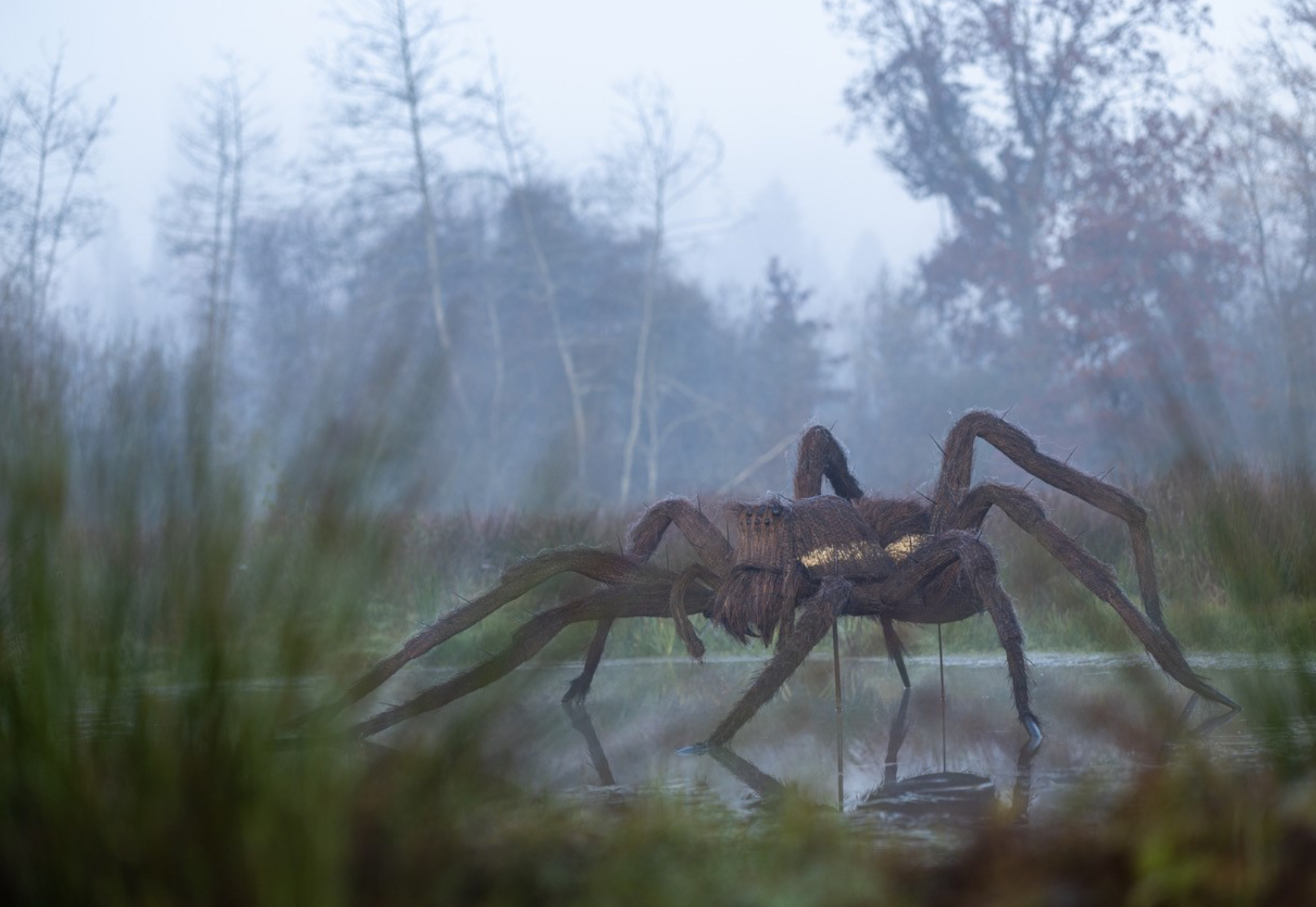 Symbole ici de biodiversité et de fragilité, cette Dolomède invite à vous plonger dans la nature, ordinaire ou extraordinaire, avec pour seule peur celle de voir ce monde s’étioler. Les zones humides et les araignées, deux entités souvent mal-aimées parce que toujours incomprises, sont ici mises à l’honneur par les artistes qui voient dans la plus infime parcelle du vivant, une raison de s’émerveiller. Invités par la Fondation Yves Rocher à considérer une prairie humide à la Gacilly, Sophie et Régis ont été impressionnés par l’existence d’une araignée pêcheuse : la Dolomède des marais.