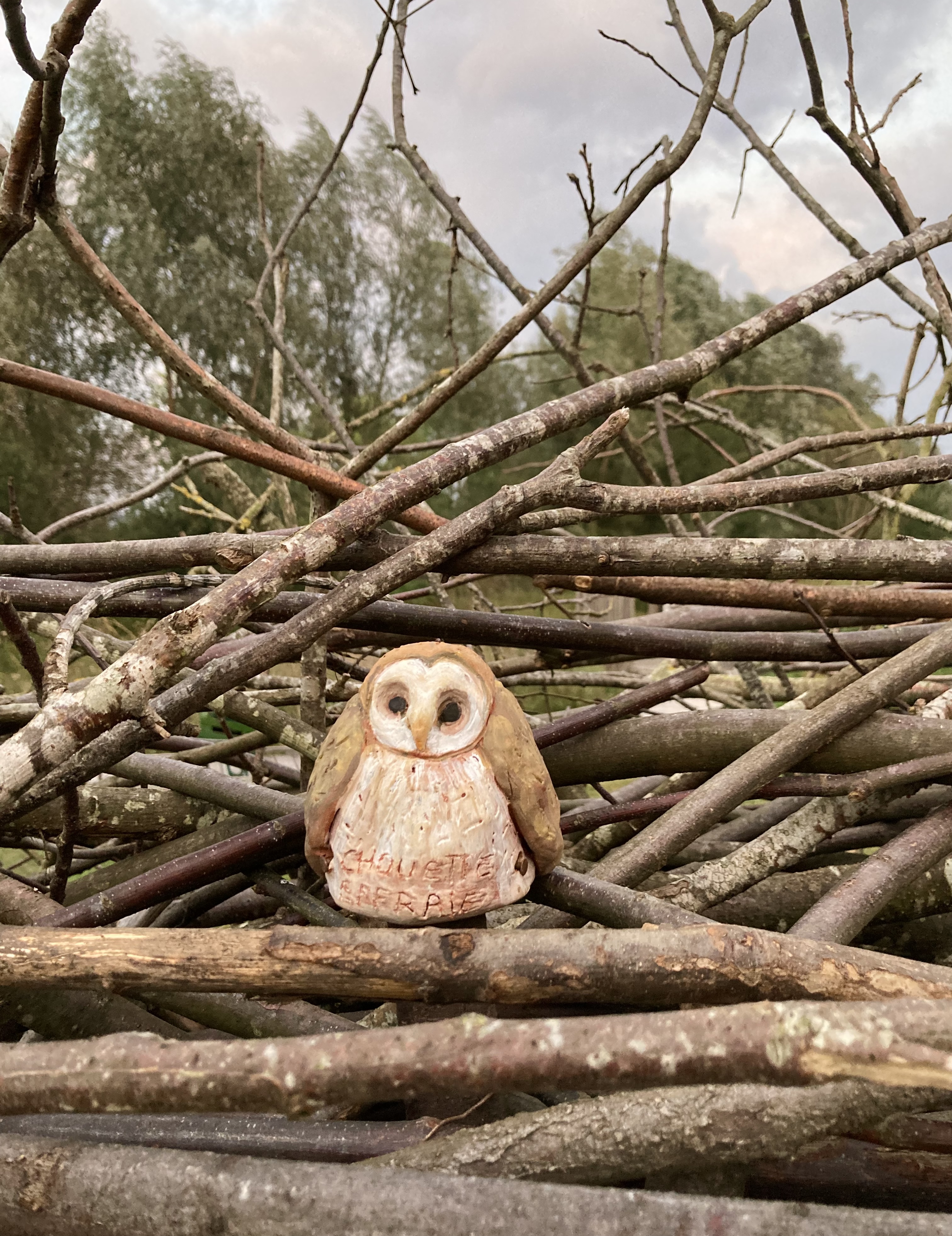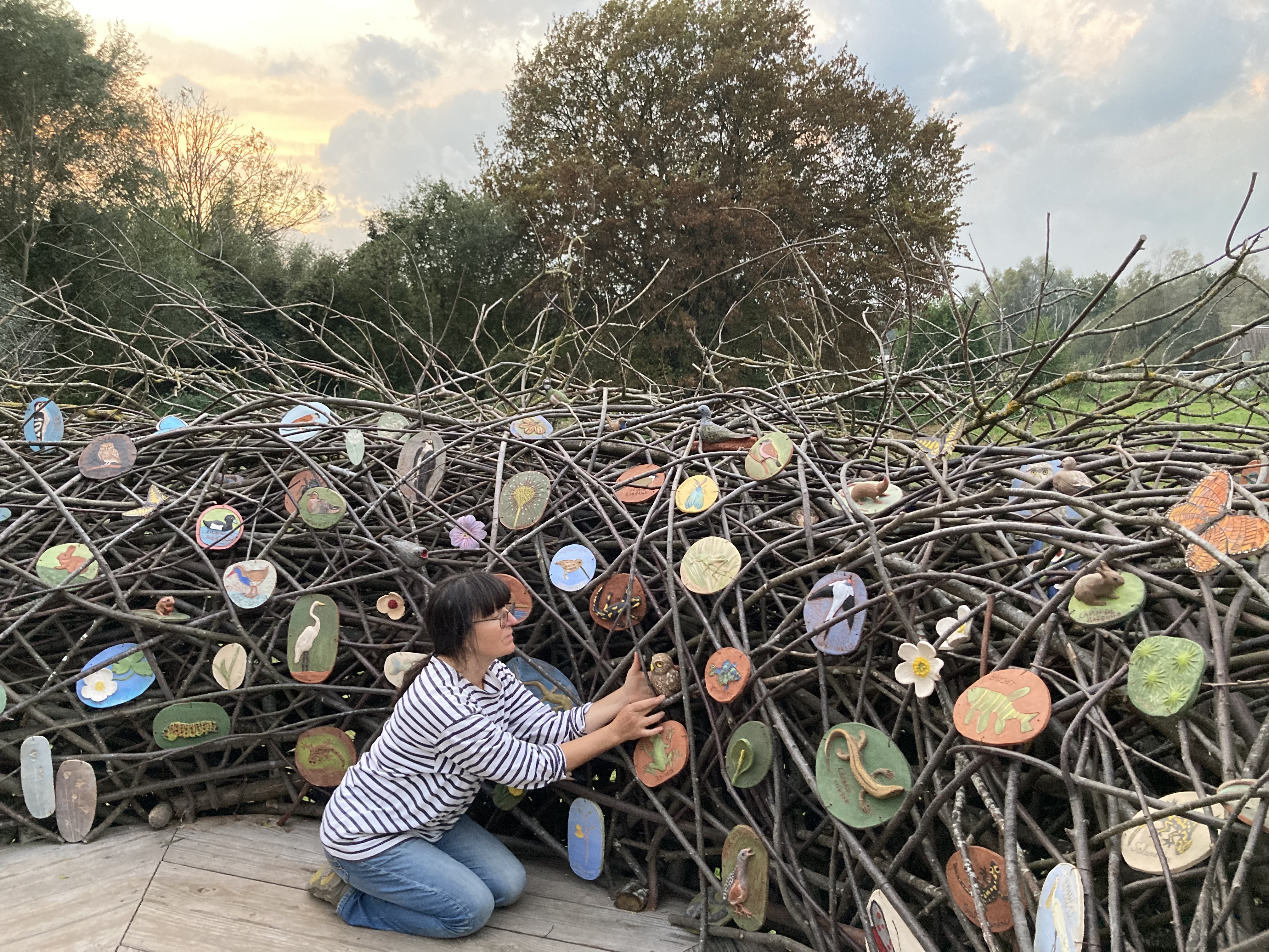 L’œuvre a été réalisée avec la participation du grand public, encadré par les artistes, lors d’ateliers de modelage de figurines en argile ainsi que pour la construction du nid.